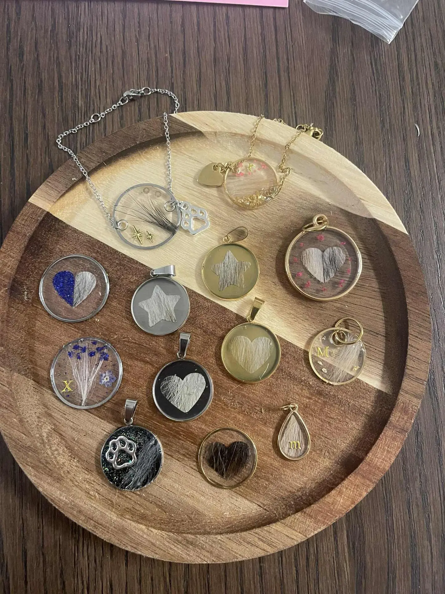 Je réalise des pendentifs uniques et personnalisés à partir des poils de votre animal. Chaque création est faite à la main avec soin, afin de conserver un souvenir précieux et durable de votre compagnon.